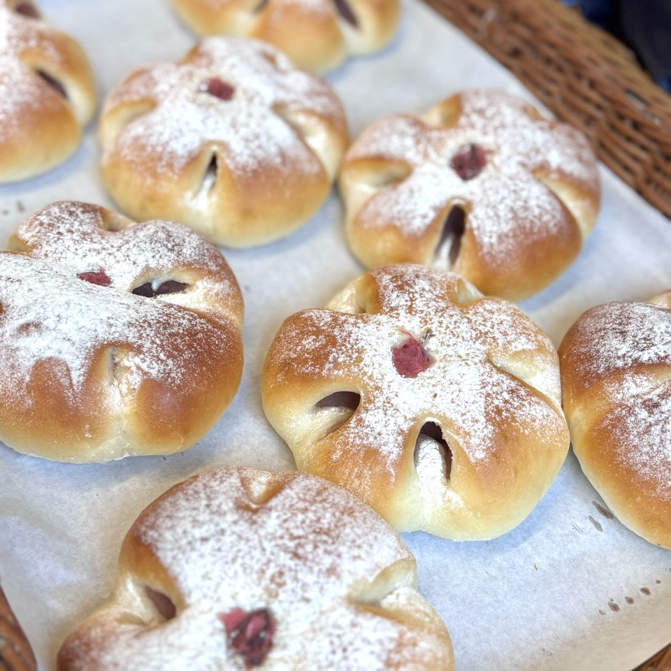 シュガーバターをのせて焼いたパンに、カフェオレ餡をサンドしました。